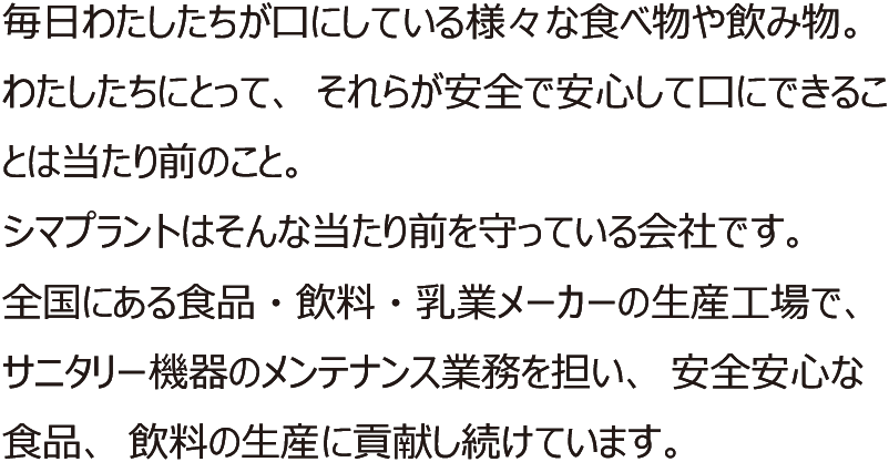 毎日わたしたちが口にしている様々な食べ物や飲み物。わたしたちにとって、それらが安全で安心して口にできることは当たり前のこと。シマプラントはそんな当たり前を守っている会社です。